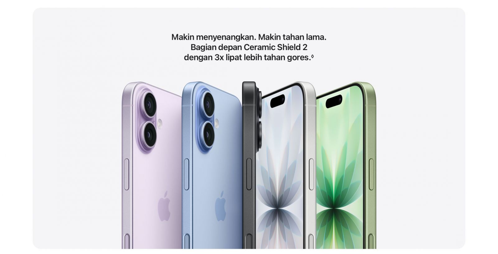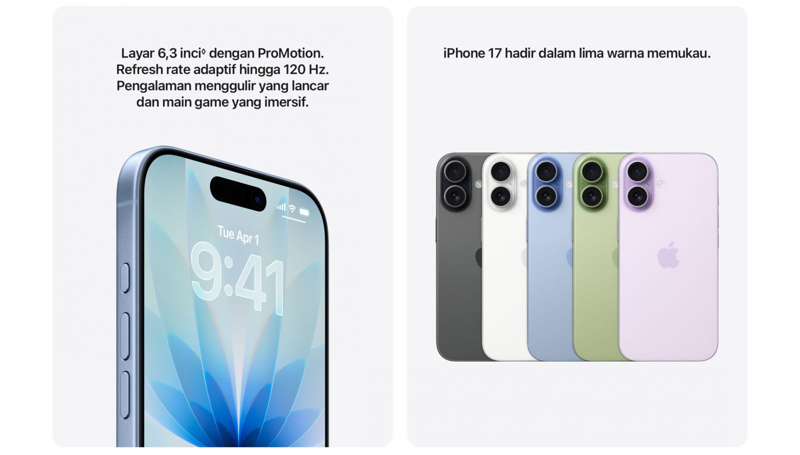 DIRANCANG UNTUK MENYENANGKAN. DIBUAT UNTUK LEBIH TAHAN LAMA. — iPhone 17 hadir dalam lima warna memukau, dengan layar 6,3 inci yang lebih terang, dan bagian depan Ceramic Shield 2 yang 3x lipat lebih tahan gores.