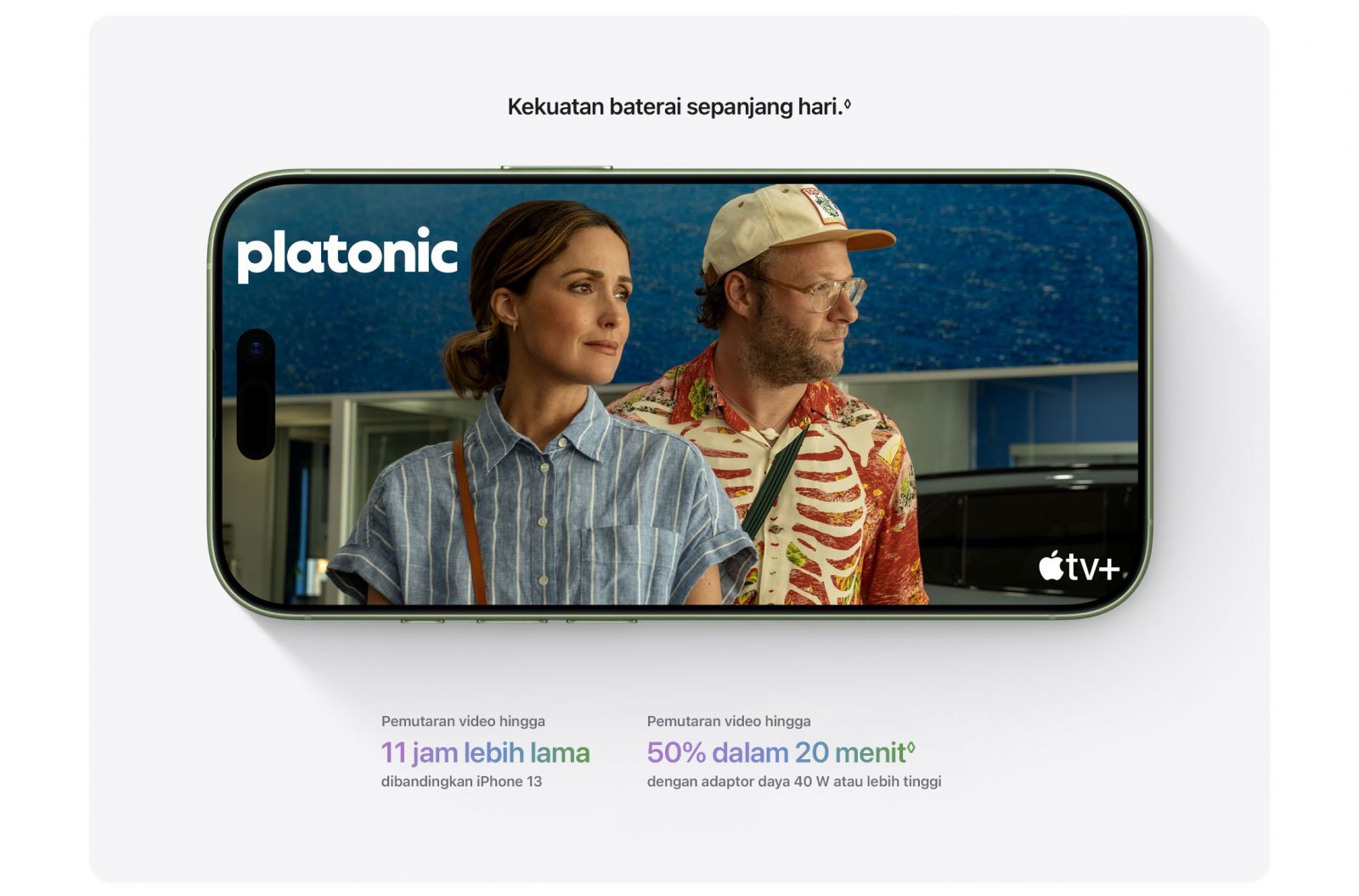 CEPAT MENGISI DAYA. TAHAN LAMA. — Kekuatan baterai sepanjang hari dengan pemutaran video hingga 30 jam. Pengisian daya hingga 50% dalam 20 menit.