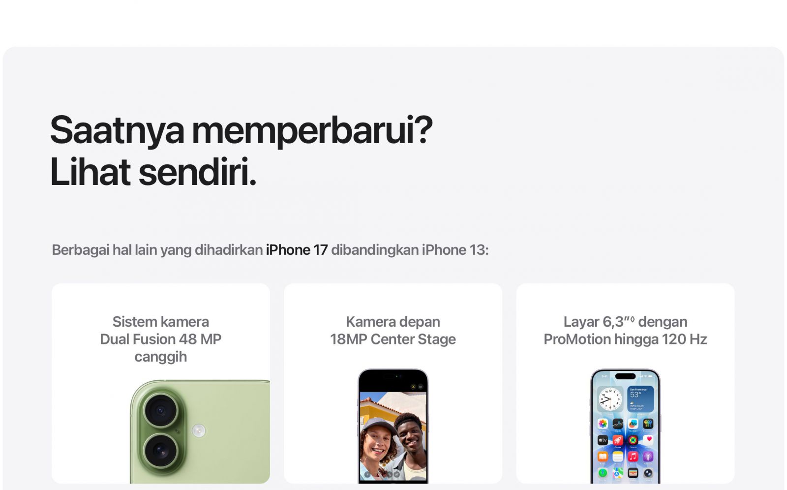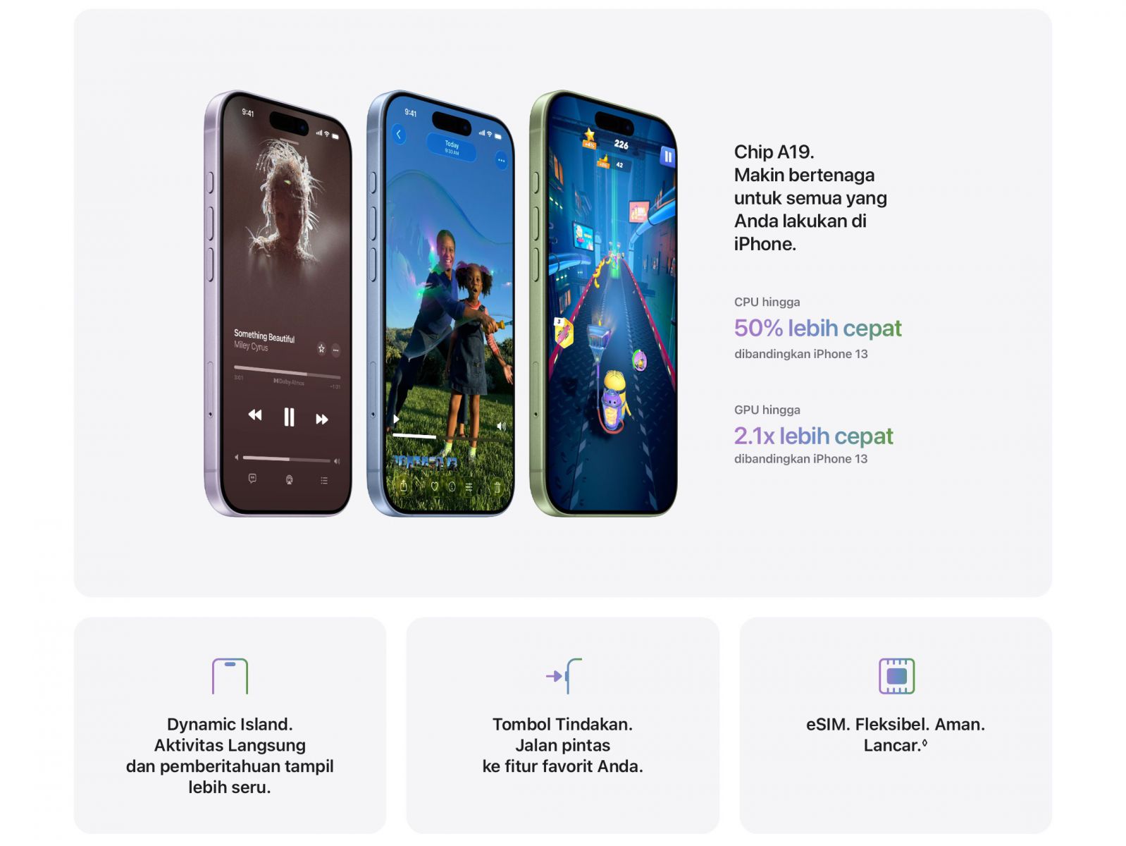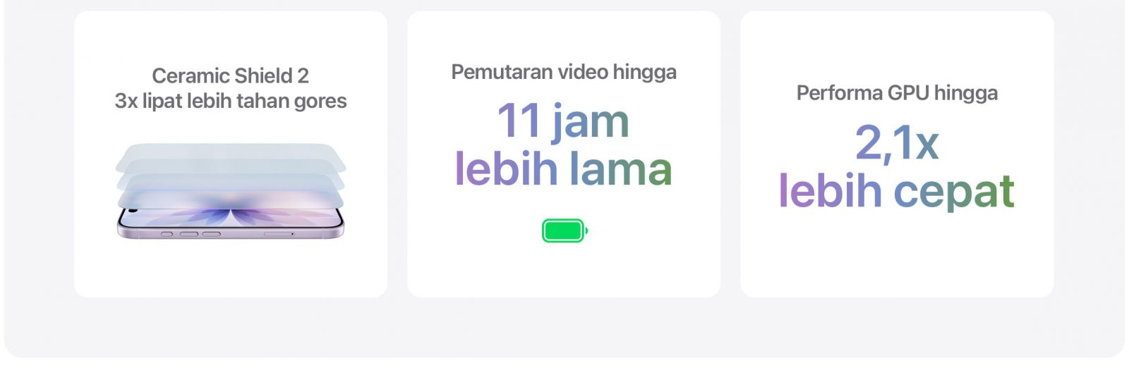 Layar ProMotion 6,3 inci, Ceramic Shield 2, semua kamera belakang 48 MP, kamera depan Center Stage, chip A19, dan banyak lagi.