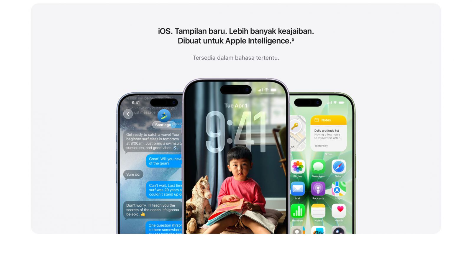 iOS 26. TAMPILAN BARU. LEBIH BANYAK KEAJAIBAN. — Desain baru dengan Liquid Glass. Indah, menyenangkan, dan tetap familier. Dengan Layar Terkunci yang lebih terang, voting dan latar belakang di Pesan yang dapat disesuaikan, Penyaringan Panggilan, dan banyak lagi.