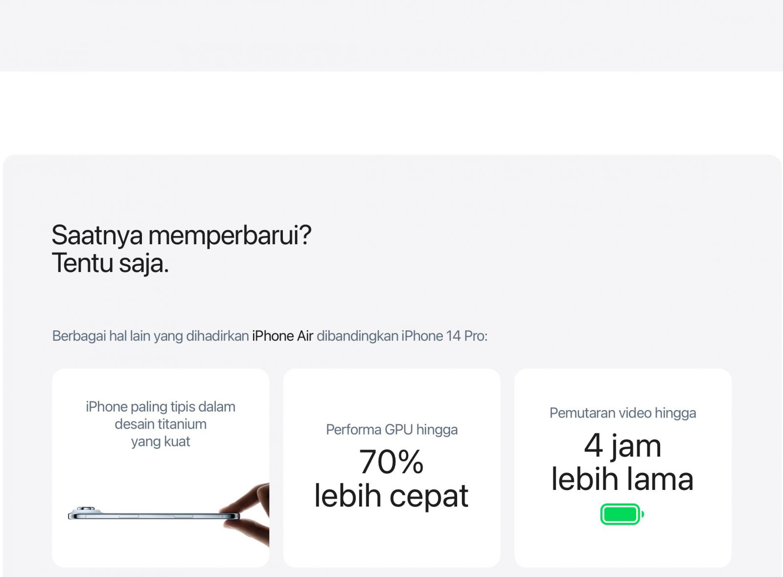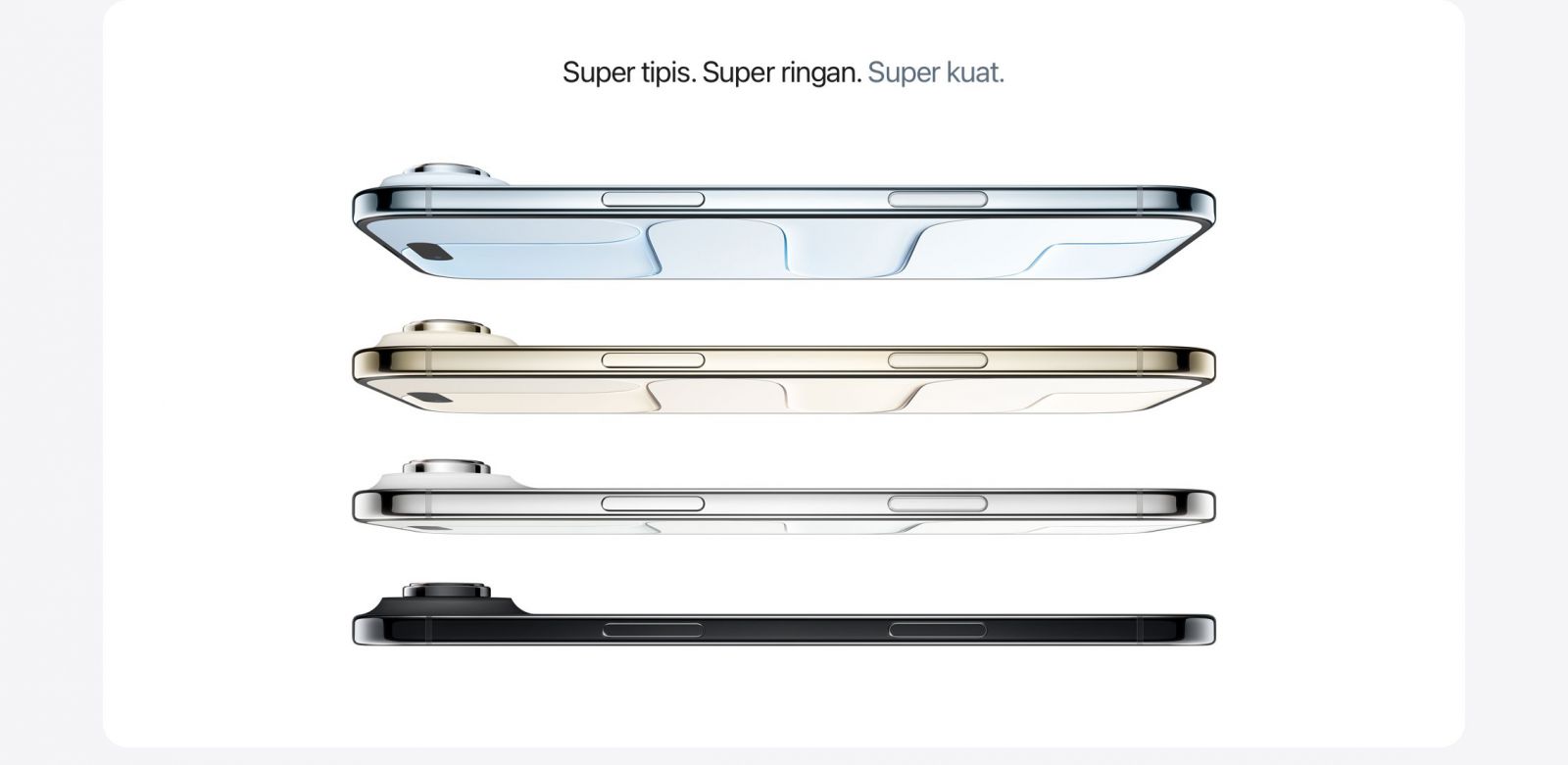 SUPER TIPIS. SUPER RINGAN. SUPER KUAT. — iPhone paling tipis yang pernah ada, dengan kekuatan chip pro di dalamnya. iPhone Air dengan ukuran 5,6 mm, luar biasa tipis dan ringan sehingga terasa nyaman digenggam.