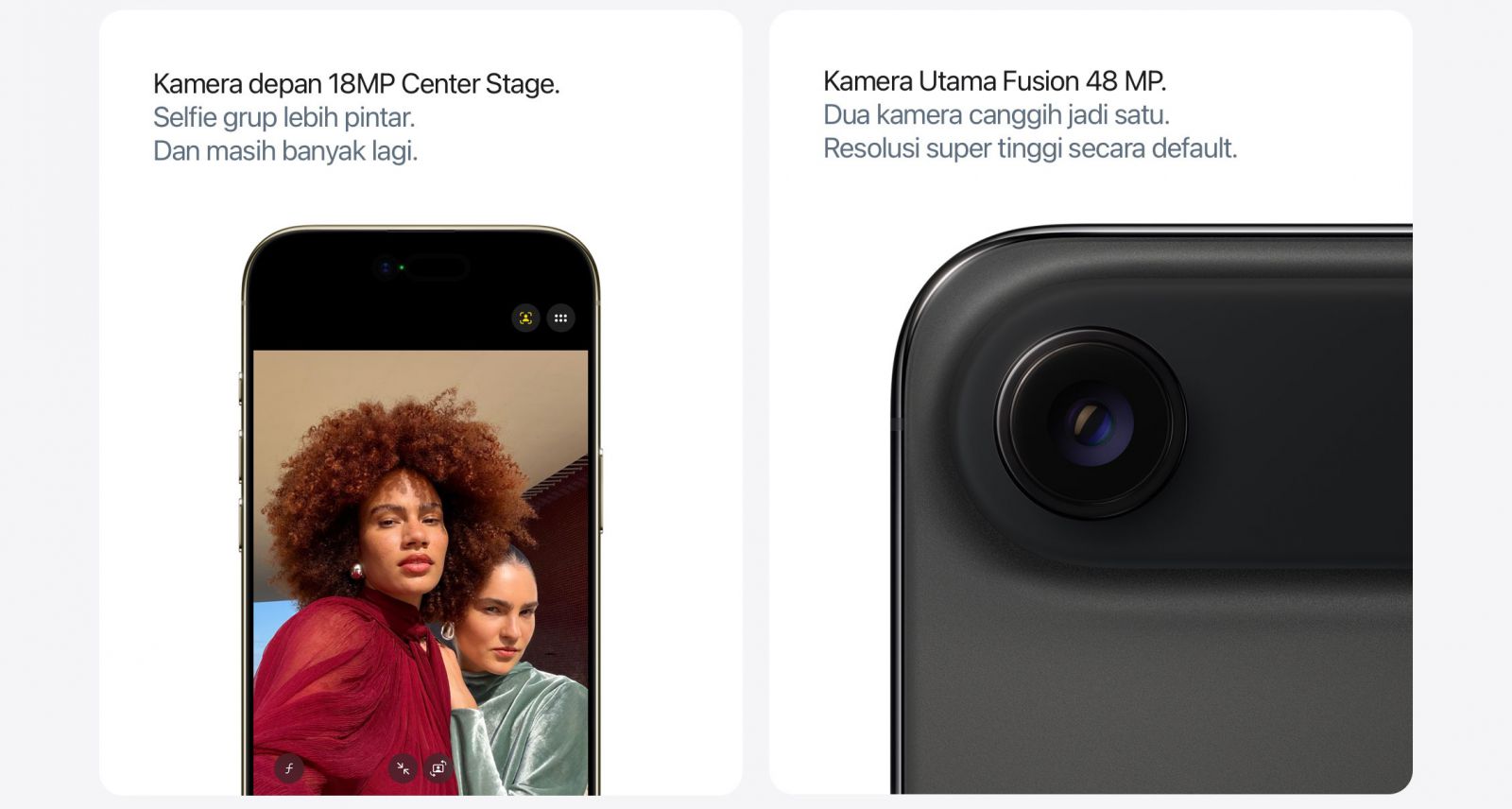 DUA KAMERA CANGGIH JADI SATU — Sistem kamera Fusion 48 MP dengan 2x zoom kualitas optik. Begitu mudah mengambil foto yang sempurna tanpa perlu mendekat.