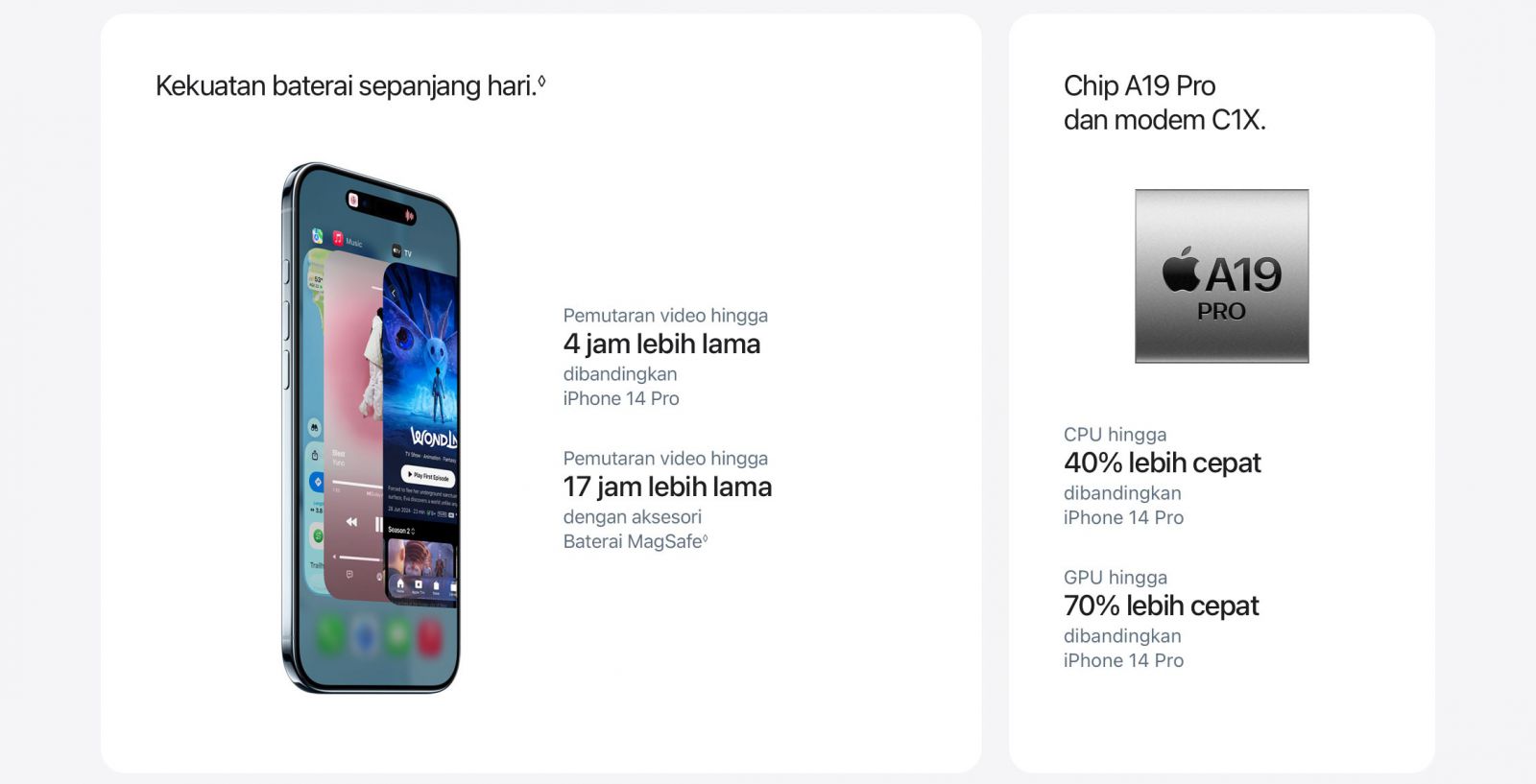 CHIP A19 PRO. SANGAT CEPAT. SANGAT EFISIEN. — A19 Pro adalah chip iPhone paling efisien yang pernah ada. Menghadirkan performa pro dalam desain terobosan yang tipis dan ringan.