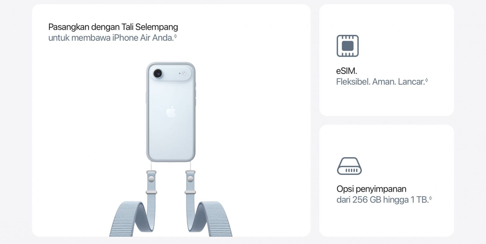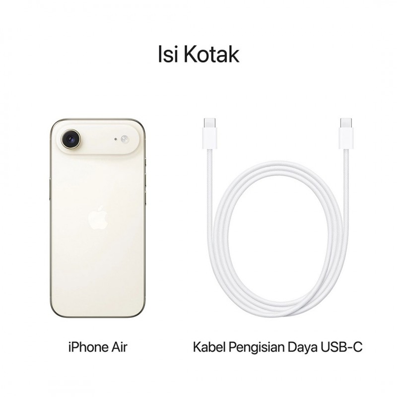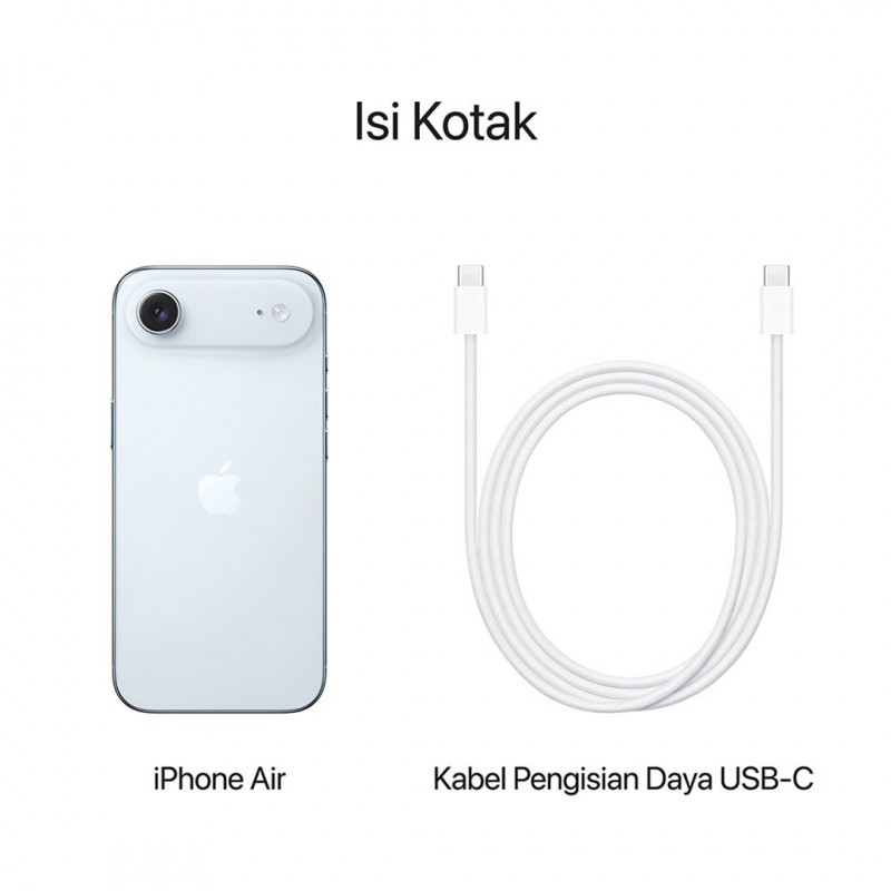 eSIM, FLEKSIBEL. AMAN. LANCAR. — iPhone Air diaktifkan dengan eSIM. Dengan eSIM, Anda menikmati lebih banyak fleksibilitas, kemudahan yang disempurnakan, keamanan yang ditingkatkan, dan konektivitas lancar, terutama saat bepergian ke luar negeri.