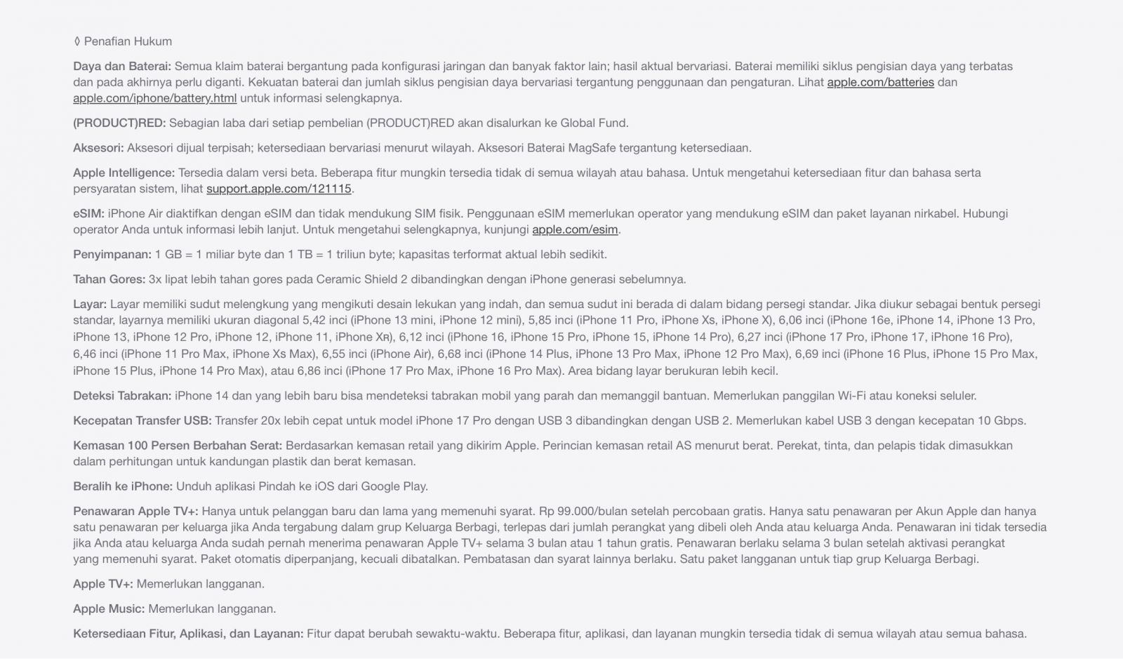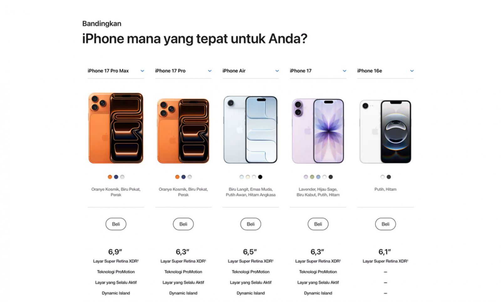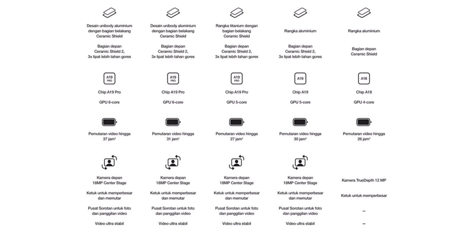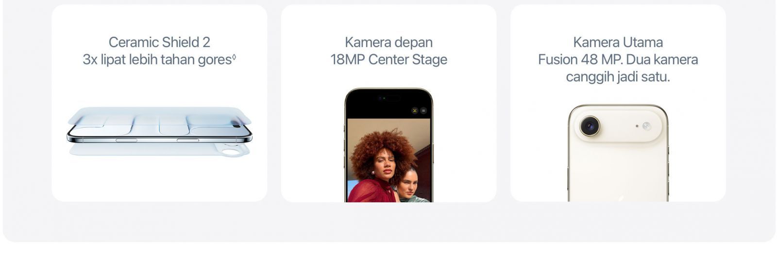 Layar 6,5 inci, Ceramic Shield kokoh depan dan belakang, chip A19 Pro, sistem kamera Fusion 48 MP, dan kamera depan Center Stage.